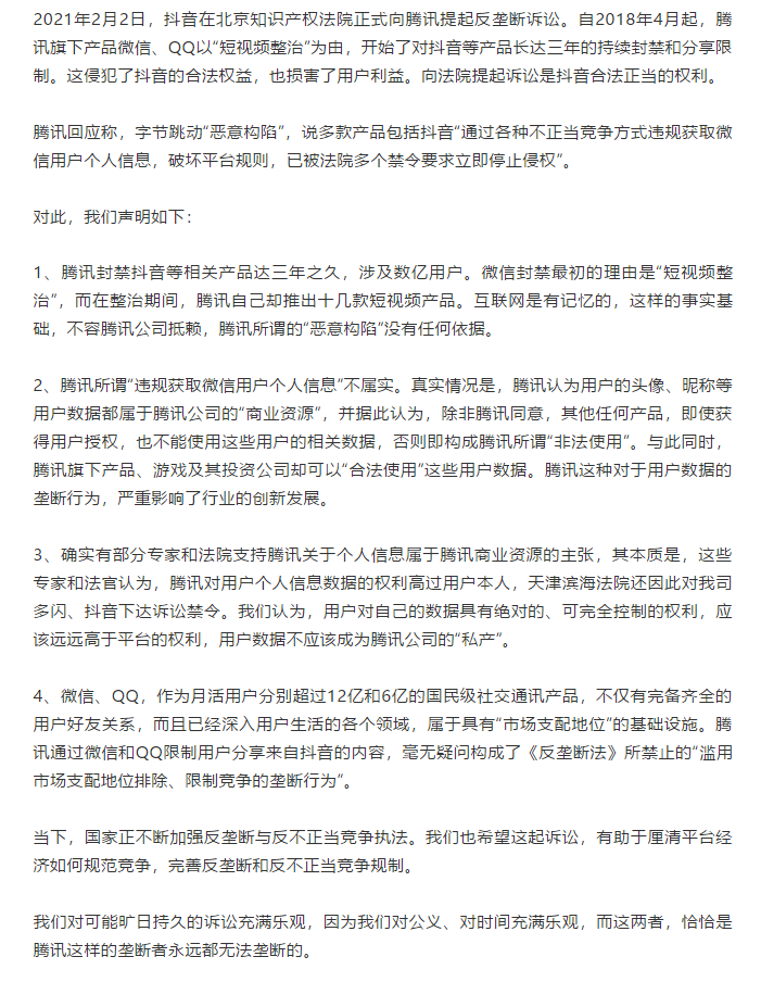 随后,抖音发表声明称,用户对自己的数据具有绝对的、可完全控制的权利,应该远远高于平台的权利,不应该成为腾讯公司的“私产”。