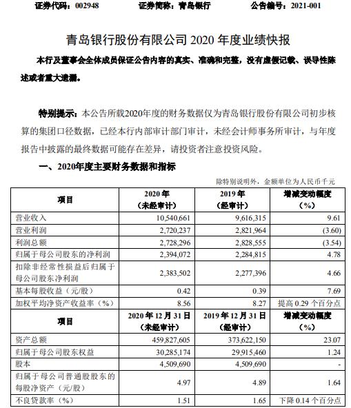 挖贝网2月4日,青岛银行(002948)近日发布2020年度业绩快报,报告期内营业收入105.41亿元,同比增长9.61%;归属于母公司股东的净利润23.94亿元,同比增长4.78%。