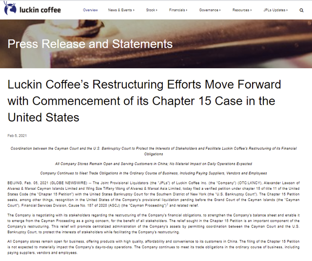 2月5日,瑞幸咖啡(LKNCY.O)在公司官网发布了公司正申请破产保护的公告。