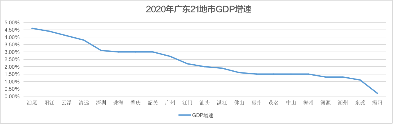 从GDP 增速来看,广东21个地级市GDP增速全部实现正增长,其中汕尾、阳江、云浮、清远、深圳、珠海、肇庆、韶关、广州9市GDP增速数据超过全国2.3%的增速数据。汕尾、阳江、云浮3市GDP增速位列全省前三位,均超过4%。