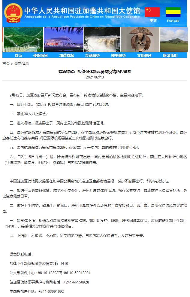 中国驻加蓬使馆再次提醒在加中国公民密切关注加卫生部疫情通报,减少不必要出行,科学有效防范。