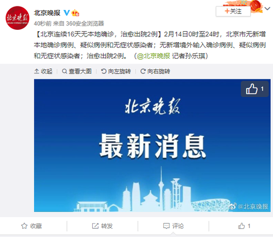 2月14日0时至24时,北京市无新增本地确诊病例、疑似病例和无症状感染者;无新增境外输入确诊病例、疑似病例和无症状感染者;治愈出院2例。(@北京晚报 记者孙乐琪)