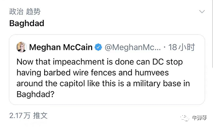 现在弹劾(特朗普)已经结束,华盛顿能不能撤掉国会周围的铁丝网,别搞得这里像是巴格达的一个军事基地?