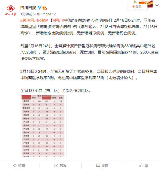 2月16日0-24时,四川新增新型冠状病毒肺炎确诊病例1例(境外输入,2月8日自缅甸乘机抵蓉,2月16日确诊),新增治愈出院病例2例,无新增疑似病例,无新增死亡病例。