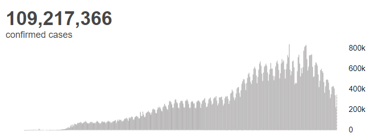 根据世卫组织最新实时统计数据,截至欧洲中部时间2月17日17时56分(北京时间2月18日0时56分),全球累计新冠肺炎确诊病例109217366例,累计死亡病例2413912例。17日全球新冠肺炎确诊病例新增348150例,死亡病例新增8251例。