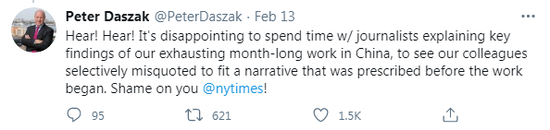 美国动物学家彼得·达萨克就痛斥:“我们花时间向记者解释了我们在中国长达一个月疲惫工作中的关键发现,而我们的同事所说的话却被断章取义,用来捏造在我们工作开始前就已设定好的报道,令人失望。《纽约时报》,你真无耻!”