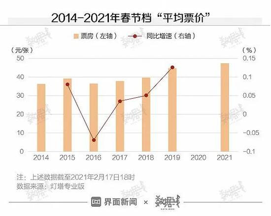 票房居高的背后,是再创历史新高的电影票价。据灯塔专业版数据,截至2月17日18时,今年春节档平均票价约为47.4元,较疫情前的2019年涨了超6%,创下除2020年以外近7年新高。
