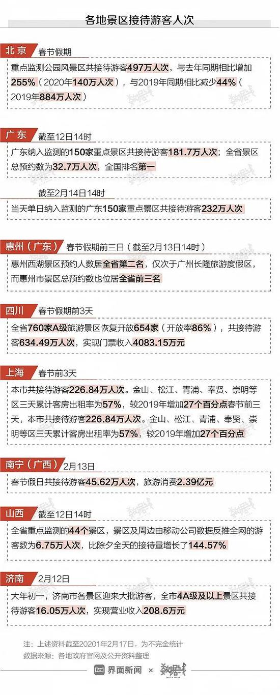 在疫情防控常态化前提下,全国多地景区游客量大幅上涨。春节期间,北京重点监测公园风景区共接待游客497万人次,与去年同期相比增加255%。截至2月12日14时,广东全省景区总预约数32.7万人次,排名全国第一。