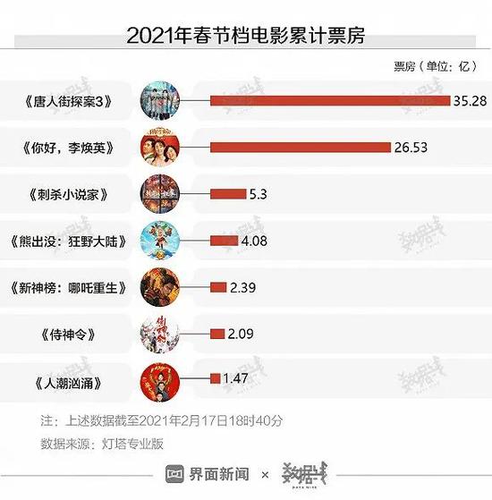 分影片来看,备受争议的《唐人街探案3》用时约5天突破35亿票房,打破13项中国影史纪录。豆瓣评分8.2分的《你好,李焕英》累计票房已超27亿。