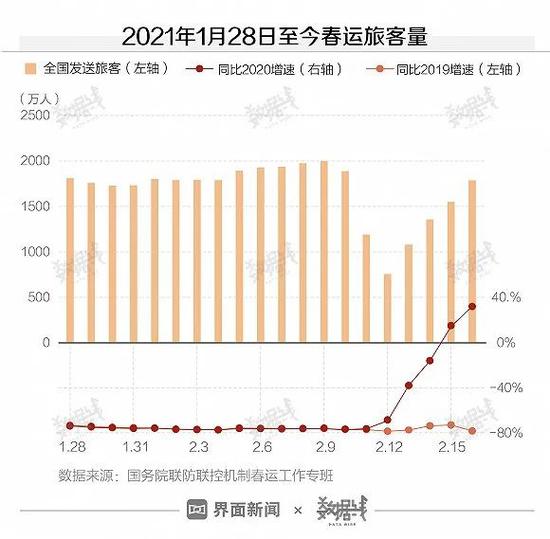 随着春节假期结束,全国春运返程开启。据国务院联防联控机制春运工作专班数据,春节前六日(除夕至初五)全国铁路、公路、水路、民航共发送旅客7724.3万人次,比2019年同期下降76.4%,较2020年同期下降43.1%。