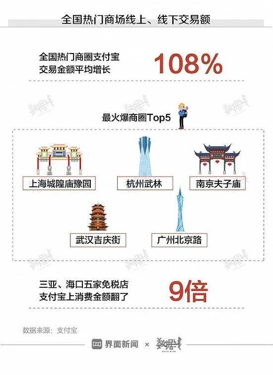 支付宝数据显示,全国热门商圈支付宝交易金额同比平均增长108%。其中,上海豫园商圈较去年春节增长305%。