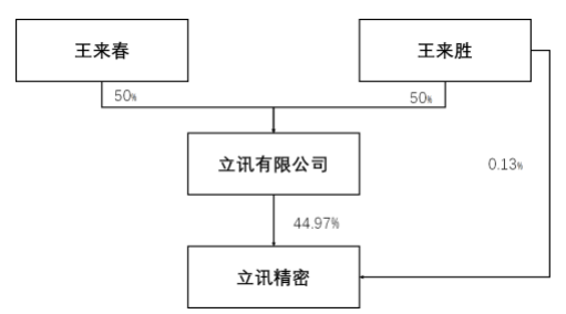公开资料显示,立讯有限由王来胜和妹妹王来春共同持有,各自持股50%。王氏兄妹是立讯精密的实际控制人。