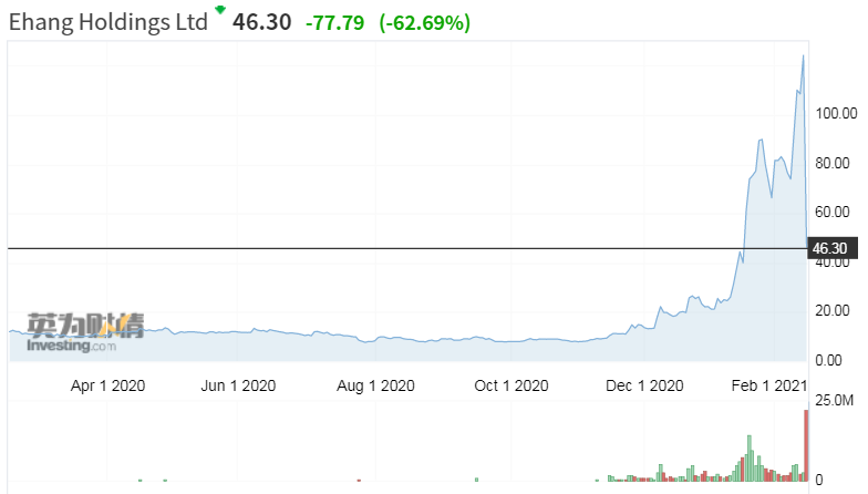 在被做空之前,亿航智能股价一路走高,从去年12月至今年2月15日,股价从14美元飙升至124美元,累计涨幅达到750%。