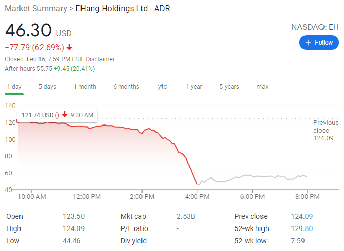 受此消息刺激,亿航股价当日大跌62.7%至46.30美元,市值一夜蒸发41亿美元(合264亿元人民币)。