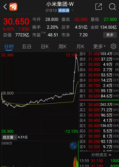 港股收市前,一则小米确定造车,或由雷军亲自带队的消息引起多方关注,小米集团股价暴力拉升,从微跌直线拉升至涨逾12%,收盘时股价涨幅6.42%,从股价启动到收盘时市值涨约500亿港元。