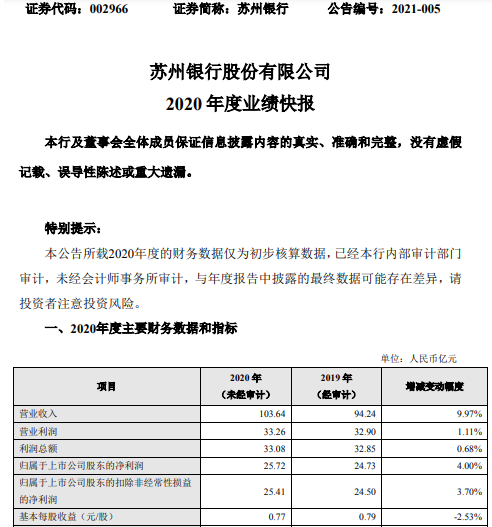 公告显示,苏州银行总资产为3880.54亿元,比本报告期初增长12.98%;基本每股收益为0.77元,上年同期为0.79元。