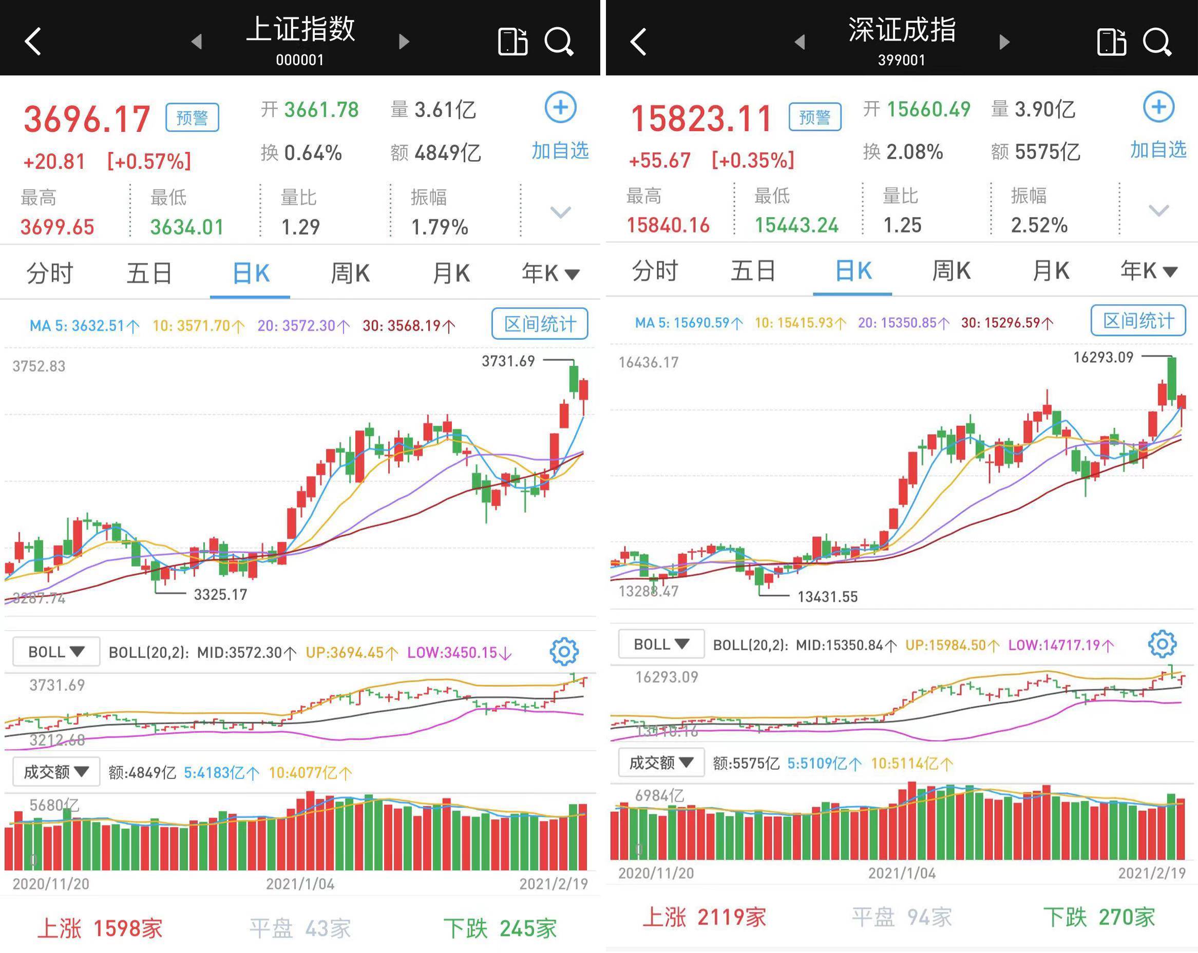 至2月19日收盘,上证综指涨0.57%,报3696.17点;科创50指数跌0.13%,报1427.91点;深证成指涨0.35%,报15823.11点;创业板指跌1.04%,报3285.53点。