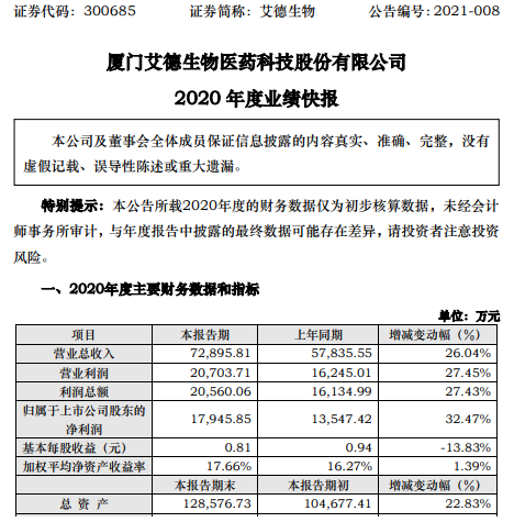 挖贝网2月18日,艾德生物(300685)发布2020年度业绩快报公告,公告显示,2020年1-12月营业总收入为7.29亿元,比上年同期增长26.04%;归属于上市公司股东的净利润为1.79亿元,比上年同期增长32.47%。