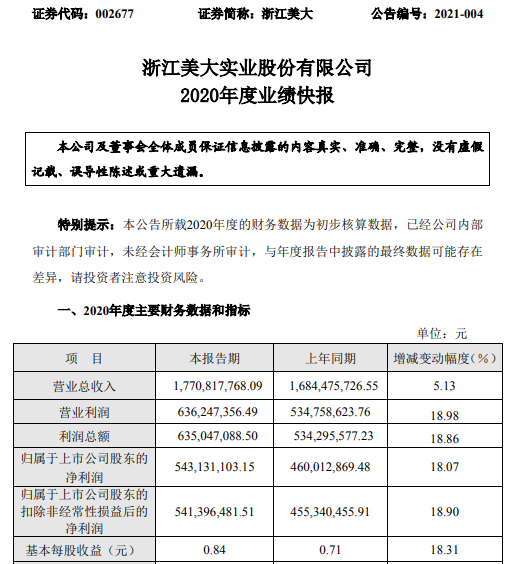 挖贝网2月21日,浙江美大(002677)发布2020年度业绩快报公告,公告显示,2020年1-12月营业总收入为1,770,817,768.09元,比上年同期增长5.13%;归属于上市公司股东的净利润为543,131,103.15元,比上年同期增长18.07%。
