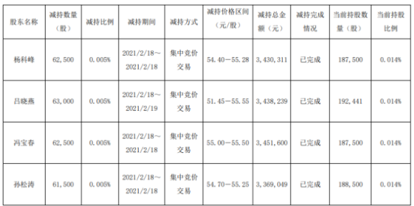 公司股东冯宝春以集中竞价交易方式减持公司股份6.25万股,本次减持价格区间为55-55.5元/股,套现345.16万元。