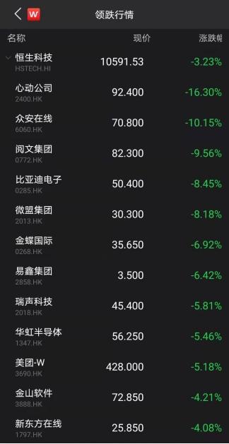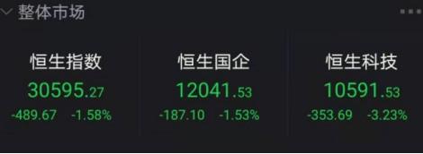 此前连续高开两天的港股,今天突然开启杀跌模式。恒生指数挫489.67点或1.58%,收报30595.27点。恒生国企指数挫187.1点或1.53%,收报12041.53点。恒生科技指数挫353.69点或3.23%,收报10591.53点。