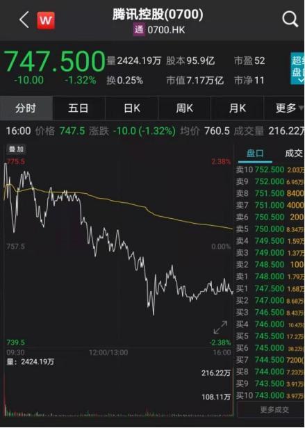 今天早盘,港股腾讯控股一度涨超2%,股价突破775港元刷新历史新高。然而午后,腾讯不断震荡回落,最终收跌1.32%,日内跌幅超3%。最新股价747.5港元,市值7.17万亿港元。