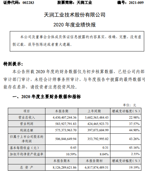 挖贝网2月21日,天润工业(002283)发布2020年度业绩快报公告,公告显示,2020年1-12月营业总收入为4,430,407,244.36元,比上年同期增长22.98%;归属于上市公司股东的净利润为506,846,649.94元,比上年同期增长43.26%。