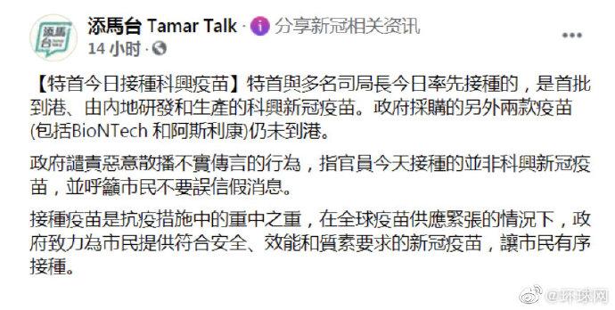 对此,港府22日傍晚在社交专页“添马台”澄清,特首与多名司局长22日率先接种的,是首批到港、由内地研发和生产的科兴新冠疫苗。政府采购的另外两款疫苗(包括BioNTech 和阿斯利康)仍未到港。
