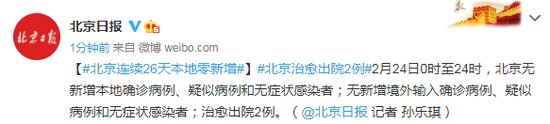 2月24日0时至24时,北京无新增本地确诊病例、疑似病例和无症状感染者;无新增境外输入确诊病例、疑似病例和无症状感染者;治愈出院2例。(@北京日报 记者 孙乐琪)