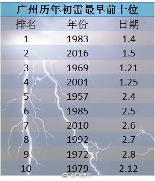 尽管惊蛰节气未到,春雷抢先鸣响,但是昨天的春雷也算不上太早。根据1981-2010年的59287站观测数据统计,广州最早雷暴出现于1983年1月4日,常年平均首场雷暴日期是3月5日,今年的初雷连前十都没排进。