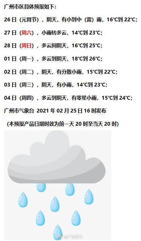 2月26日(元宵):阴天,有小到中(雷)雨,16~22℃(最低气温出现在26日20时);