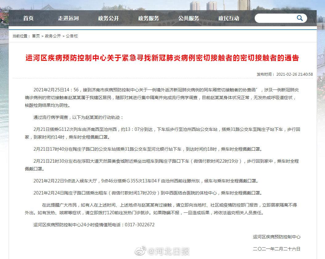 2021年2月25日14:56,接到济南市疾病预防控制中心关于一例境外返济新冠肺炎病例的同车厢密切接触者的协查函”,涉及一例新冠肺炎确诊病例的密切接触者赵某某属于我辖区居民,随即对其进行集中隔离并完成流行病学调查,目前赵某某身体状况正常,无发热或呼吸道症状,核酸检测结果均为阴性。