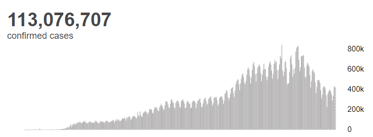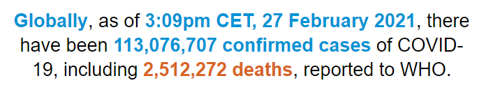 根据世卫组织最新实时统计数据,截至欧洲中部时间2月27日15时09分(北京时间2月27日22时09分),全球累计新冠肺炎确诊病例113076707例,累计死亡病例2512272例。27日全球新冠肺炎确诊病例新增420491例,死亡病例新增10939例。