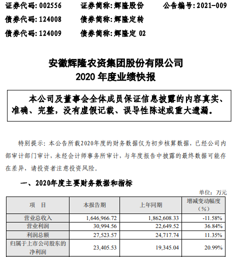 挖贝网2月27日,辉隆股份(002556)发布2020年度业绩快报公告,公告显示,2020年1-12月营业总收入为1,646,966.72万元,比上年同期下滑11.58%;归属于上市公司股东的净利润为23,405.53万元,比上年同期增长20.99%。
