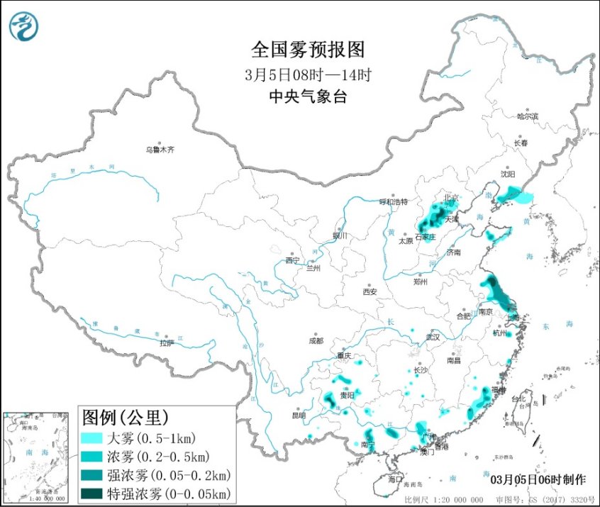 预计,3月5日早晨至上午,辽宁南部、北京南部、天津北部、河北中南部、山东东部、江苏中南部、上海北部、福建东南部、贵州中南部、广西南部、广东中部等地的部分地区有大雾,其中,河北中部、江苏中南部、贵州西南部等地的部分地区有能见度低于200米的强浓雾,局地有能见度低于50米的特强浓雾。此外,5日上午,黄海北部沿岸海域、山东半岛东部沿岸海域将有能见度不足1公里的大雾。