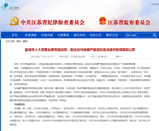 昨日下午,江苏省纪委监委传发布通告,盐城市人大常委会原党组成员、副主任马俊健严重违纪违法被“双开”。