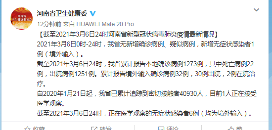 2021年3月6日0时-24时,我省无新增确诊病例、疑似病例,新增无症状感染者1例(境外输入)。