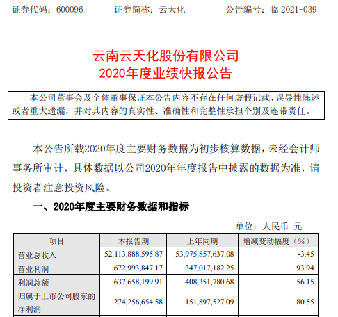 挖贝网3月5日,云天化(600096)发布2020年度业绩快报公告,公告显示,2020年1-12月营业总收入为52,113,888,595.87元,比上年同期下滑3.45%;归属于上市公司股东的净利润为274,256,654.58元,比上年同期增长80.55%。