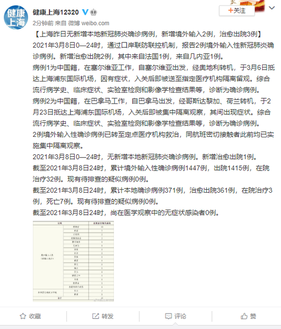 截至2021年3月8日24时,累计境外输入性确诊病例1447例,出院1415例,在院治疗32例。现有待排查的疑似病例0例。