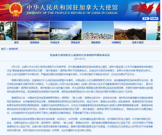香港特区的选举制度是中国的地方选举制度,如何设计、如何发展、如何完善完全是中国内政,任何国家无权说三道四。中方维护国家主权、安全、发展利益的决心坚定不移,坚持贯彻“一国两制”、“港人治港”、高度自治方针、维护香港长期繁荣稳定的决心坚定不移,反对外部势力干预香港事务的决心坚定不移。加拿大等少数西方国家破坏香港稳定、阻碍中国发展的图谋注定不会得逞。中方敦促加方立即停止以任何形式干涉香港事务和中国内政,否则只能给中加关系造成进一步损害,也必将遭到中方坚决有力回击。
