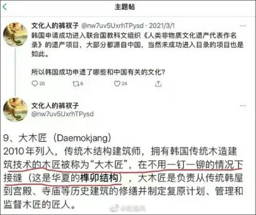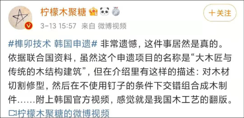 还有网友找出了中国和韩国申遗内容的官方介绍视频进行对比,也发现韩国视频中的木匠技术和中国视频里的内容高度相似。