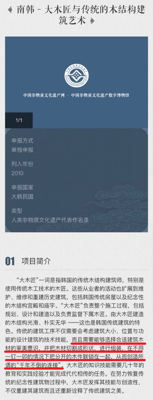 不过,有网友发现,韩国于2010年申报成功的“大木匠与传统的木结构建筑艺术”中,也包括类似于“榫卯技术”的描述。