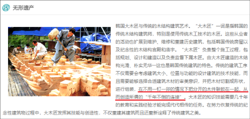 在前身为韩国驻华大使馆文化新闻处的驻华韩国文化院官网上,关于韩国“无形遗产”的名录中包括“大木匠”一项,其中的介绍内容与中国非物质文化遗产网上的内容完全一致。