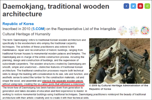 在中国非物质文化遗产网中,韩国这项非物质文化遗产的介绍包括“在不用一钉一卯的情况下把分开的木件联锁在一起,从而创造所谓的‘千年不倒的连接’”的内容。