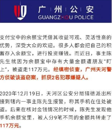【余额宝存款遭朋友“盯上”被盗百万元,广州天河警方抓获两名“损友”】支付宝中的余额宝凭借其收益可观、灵活性高的优势,深受大众的欢迎。很多人都会把自己的积蓄存入余额宝,进行投资赚钱。而近日,事主陈先生就因为余额宝中存有大量金额遭朋友“盯上”,被盗走117万元。经缜密侦查,@广州天河公安 侦破该盗窃案,抓获2名犯罪嫌疑人。