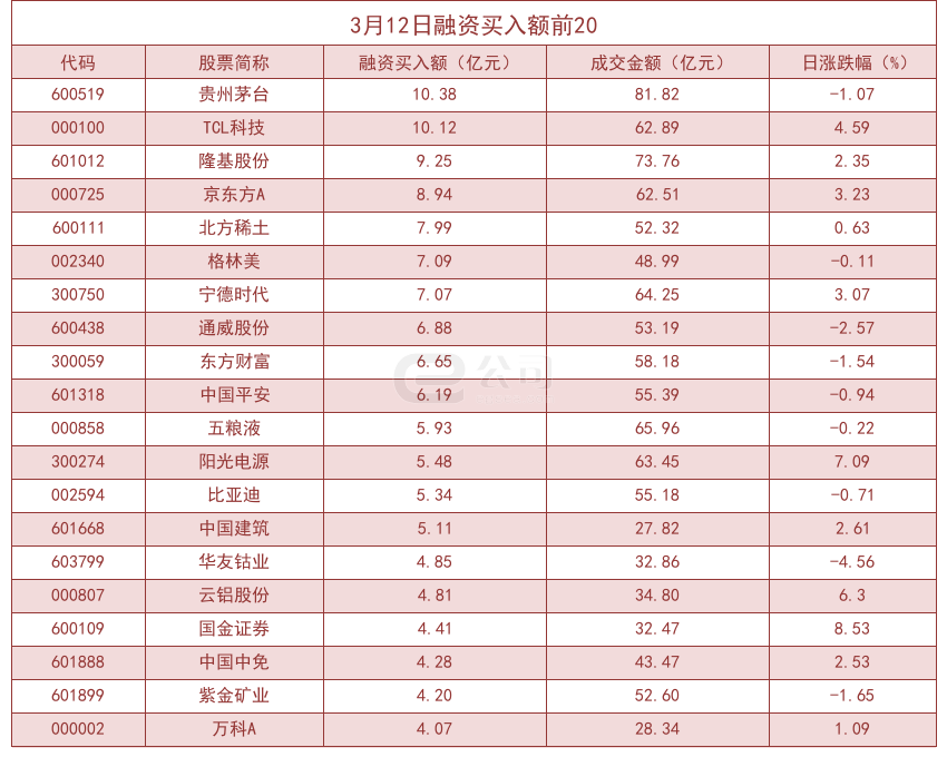 从融资资金买入金额来看,共有143只个股买入金额超亿元,其中贵州茅台(10.38亿元)、TCL科技(10.12亿元)、隆基股份(9.25亿元)居前三位。