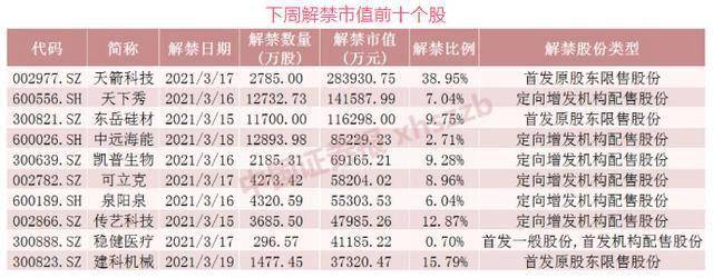 具体来看,天箭科技3月17日将解禁2785.00万股,均为首发原股东限售股份。天下秀3月16日将解禁1.27亿股,均为定向增发机构 配售股份。东岳硅材3月15日将解禁1.17亿股,均为首发原股东限售股份。