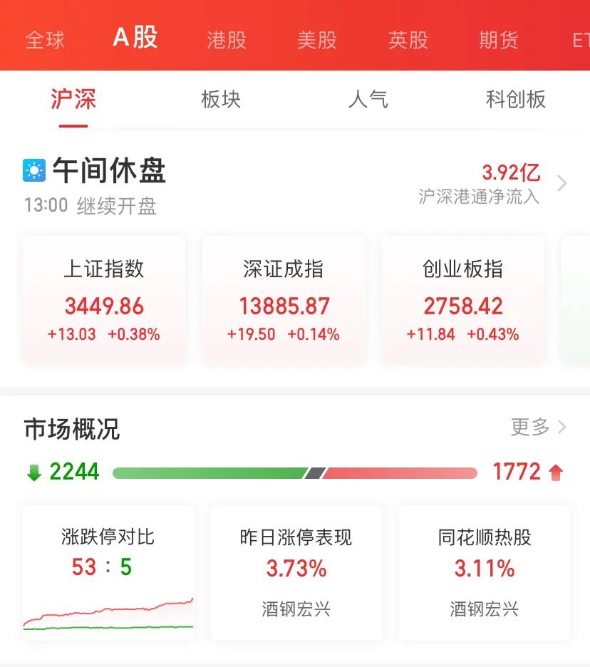 上午收盘,三大指数在V形震荡后,全线飘红;上证指数涨0.38%,深证成指涨0.14%,创业板指数涨0.43%,两市成交额5077亿元。不过个股却是涨少跌多,下跌的2244个,上涨的1772个。