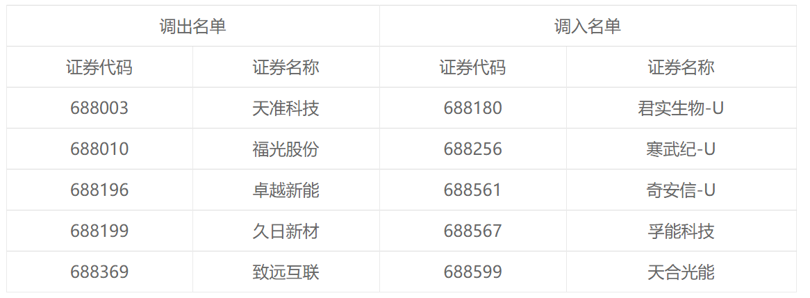 3月15日,资本邦了解到,科创50指数成份股的本次调整将于今日(3月15日)正式生效。此次该成分股调整的比例为10%,天准科技、福光股份、卓越新能、久日新材与致远互联被调出,君实生物-U、寒武纪-U、奇安信-U、孚能科技、天合光能获调入。