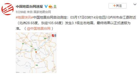 #地震快讯#中国地震台网自动测定:03月17日03时14分在四川泸州市合江县附近(北纬28.65度,东经105.68度)发生3.1级左右地震,最终结果以正式速报为准。